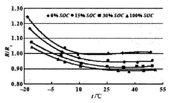鋰電池溫度與電阻的關(guān)系,如下圖所示。不同的曲線代表電池自身不同的荷電量。任何一個荷電量下,電池內(nèi)阻都隨著溫度的降低而明顯升高,荷電量越低的電芯,內(nèi)阻越大,并且這個趨勢也隨著溫度的變化而保持不變。
